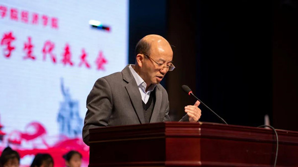 经济学院刘天祥院长致辞。刘院长结合康德的名言谈到:“成长需要头顶灿烂的星空和心中的道德相伴。”而外部环境对“道德相伴”极其重要,团总支学生会恰恰是外部环境的创造者和保障者,所以建设好团总支学生会极其重要。共青团是党的后备军,刘院长希望经济学院的青年们能够通过融入发展的洪流来实现人生价值,为国家和学校建设做贡献。另一方面,刘院长表示,我们要紧抓“教学线”和“学工线”共同完成人才培养的全过程,实现专业知识与能力、心理与身体素质的显著提升。最后刘院长号召经济学院青年学生以热血铸就青春无悔事业!