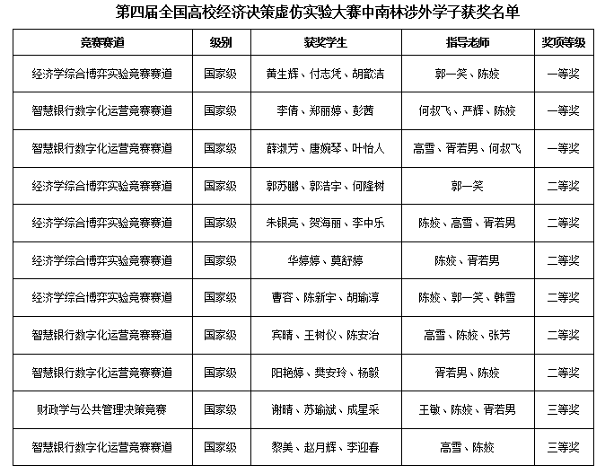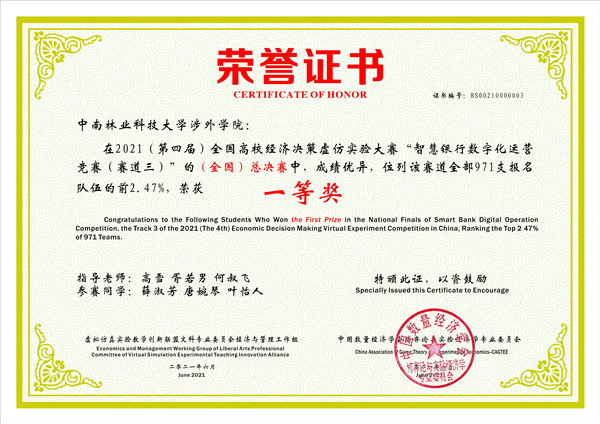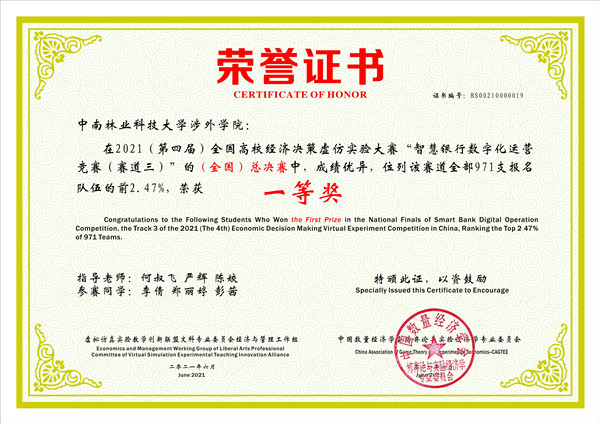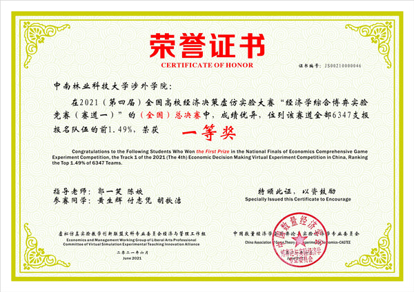 近日,由中国数量经济学会博弈论与实验经济学专业委员会、虚拟仿真实验教学创新联盟文科类工作委员会经管工作组主办,西交利物浦大学承办的2021年全国高校经济决策虚仿实验大赛全国总决赛圆满落下帷幕。中南林涉外代表队与来自全国284所高校的6399支参赛队伍19197名选手同台竞技,最终我院晋级全国总决赛的11支队伍全部获奖,其中3支队伍获全国一等奖,6支队伍获全国二等奖,2支队伍获全国三等奖。