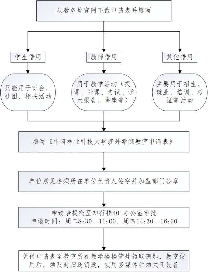 借用人于教务处网站下载填写《中南林业科技大学涉外学院教室申请表》,具体流程如下: