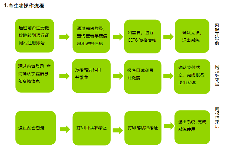 n CET笔试考试进行前的所有操作都在本系统进行,包括报名、缴费、打印准考证。