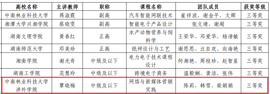 其中,我院信息与工程学院蒋亚平团队(团队成员:马发强、杨露)获得湖南省普通高校教师教学创新大赛新工科组三等奖,管理学院覃晓梅团队(团队成员:陈莉、韩雪、柴娟娟)获得湖南省普通高校教师教学创新大赛产教融合组三等奖。