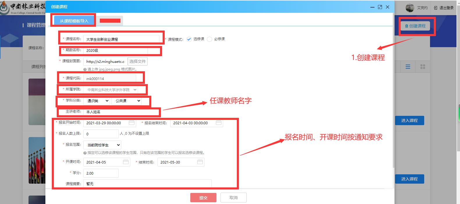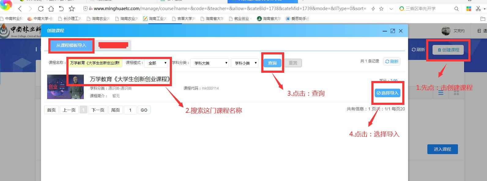 第四步:创建课程界面。1.点击:创建课程;2.搜索:万学教育《大学生创新创业课程》;3.点击:查询;4.点击:选择导入;