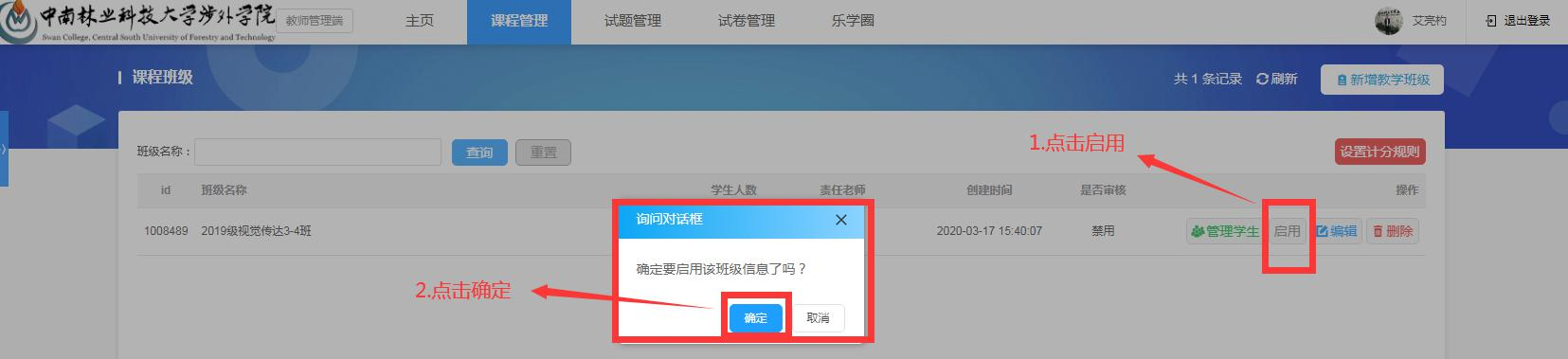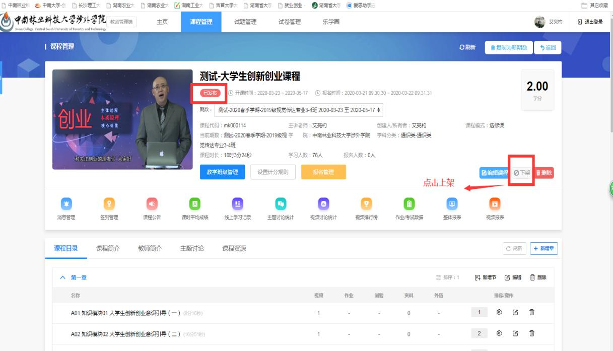 第十一步:启用课程。在课程管理主页面。点击“上架”(点击上架按钮后会显示为“下架”,表示已上架)。课程发布成功。