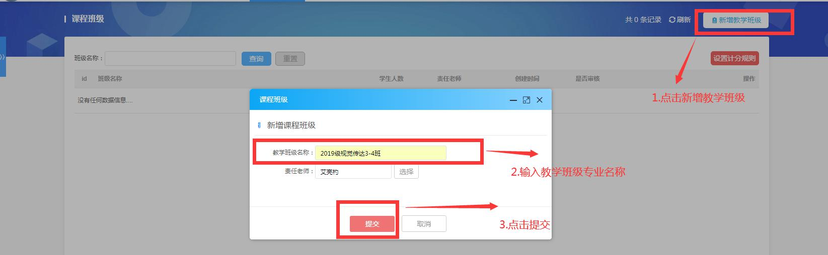 第七步:1.点击新增教学班级;2.输入所带教学班年级、专业、班级;3.完成点击提交。特别提醒:课程只做一个,把所有你带的班级学生都加选进这个课程里来;