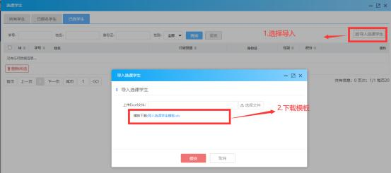 第九步:1.选择导入;2.下载模板。注意:学生名单以学院教务系统学生花名册为准导入;