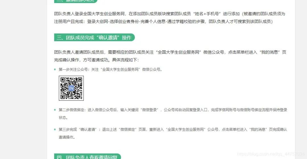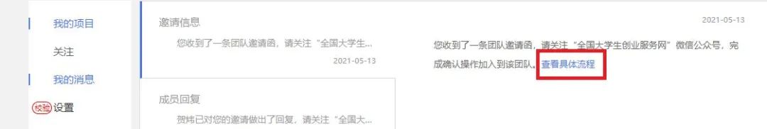 完成“确认邀请”:重新进入“全国大学生创业服务网”公众号,点击菜单栏进入“我的消息”页完成确认邀请操作。