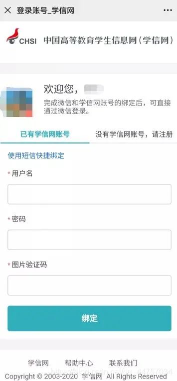 若已有学信网账号,直接登录即可完成绑定;若没有学信账号需完成注册流程。