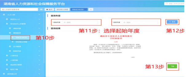学时审核通过后,第10步:点击“学时证书打印”。第11步:选择所需的起始年度。第12步:点击“查询”。第13步:点击下载,下载保存学时认定单。