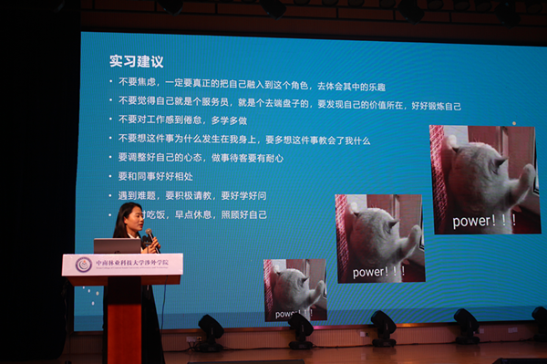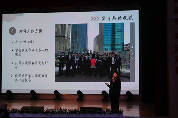 来自深圳星河丽思卡尔顿酒店的实习生代表李湘用“恰得苦”“耐得烦”和“霸得蛮”概况了她的实习体会,用自己的亲身经历告诉同学们要耐心、细心和贴心。