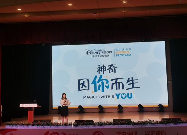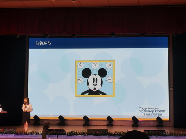 分享会上,上海迪士尼度假区校园关系团队的Nicole向同学们详细地介绍了华特迪士尼公司、上海迪士尼度假区、秋季实习生招聘项目和员工薪酬福利及培训发展的相关情况。
