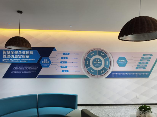 智慧全景实验室是以企业的创立、运营管理为核心,集人财物、供产销等核心业务和工商、税务、银行等关联业务于一体,全流程、全要素有机融合的全景仿真实验室。实验室占地约1000平方米,配备有140余套实验软件教学终端,可满足我院跨专业的综合性实验需求。