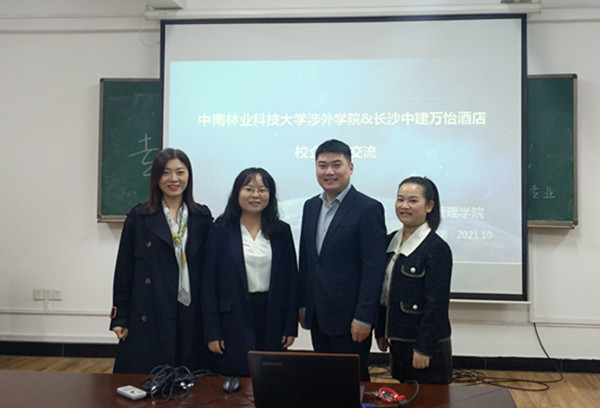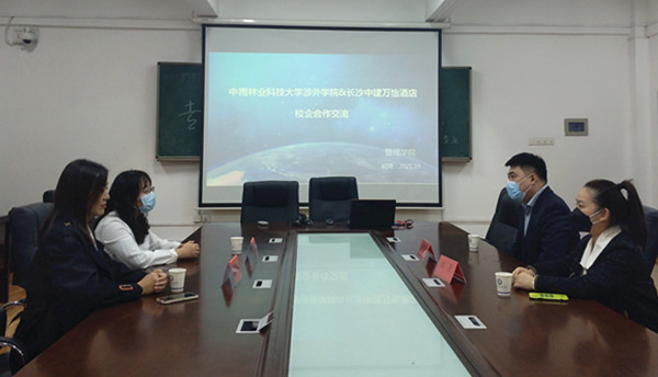 2021年10月26日上午,管理学院副院长肖菲、旅游管理教研室主任李穗菡在1204会议室接待了长沙中建万怡酒店人力资源黄可欣总监等人一行,就校企专业共育、学生实习实训展开了深入的交流。