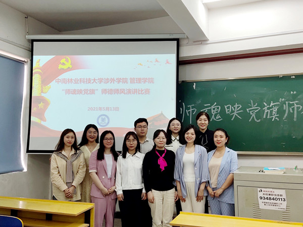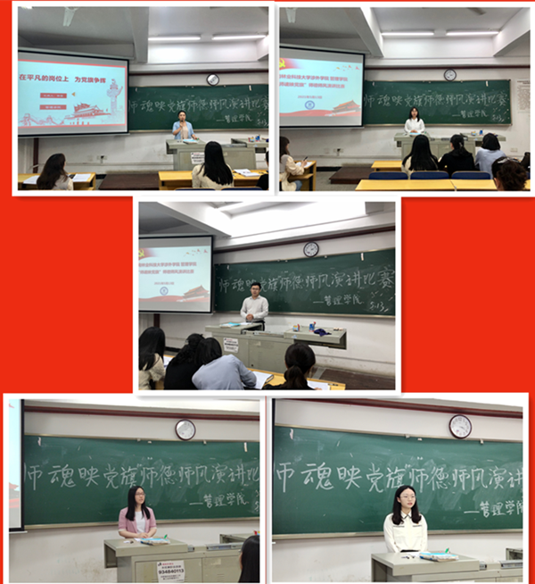 值此中国共产党成立100周年之际,为继承和发扬党的优良革命传统,全面落实立德树人根本任务,切实提升我院教师思想政治素质和敬业奉献精神,培养良好的师德风尚和氛围,2021年5月13日下午,管理学院在1308举行了一场以“师魂映党旗”为主题的师德师风教师演讲比赛。