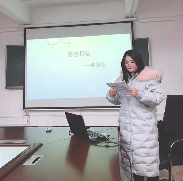 谢慧敏老师的主题是感恩相遇,分享了与同学们之间的点点滴滴,表示辅导员工作是非常有幸福感的一份职业,一边播种一边收获,念念不忘必有回响,希望所有辅导员都能不忘初心 ,带着感恩之心一路前行。