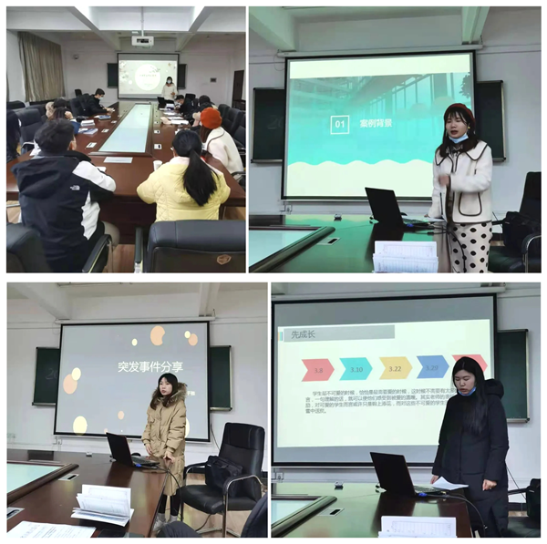 吴姣姣、刘于雅、侯银银和朱文韵老师分享了学生突发事件处理方法,在当前的教育形式下,对一所学校而言,如何应对学生中的突发事件,是学校工作中不可忽视的问题,学生的安全教育更是学校的工作重点之一。四位老师呼吁大家要更多的关心关爱学生,尤其是学生的身心健康方面。