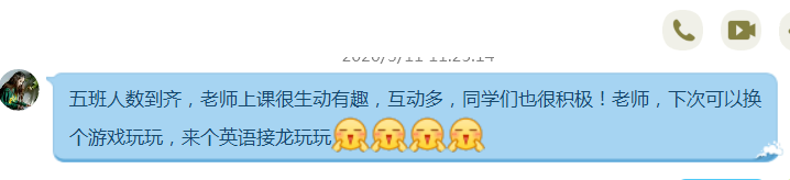 课堂上,大家上课认真积极,有一个教学班第一次课比较安静,第二次课气氛非常非常好,上完课大家都觉得好开心,而且这个班有几位男生和女生的发音非常的漂亮。以后可以在role play 中发挥更好的带头作用。当然,作为老师一定要注意给更多同学公平的练习机会。好的及时鼓励肯定,不足的耐心温和引导纠正。还有两个教学班非常认真也活跃,课堂的互动延续到课下,令人心情愉悦。在第二次课因为有二十个左右同学反映由于打雷所以家里的网络不畅的因此出现卡顿,所以一度有点点混乱,但及时有同学自发帮我在群里同步教学画面,使课堂顺利完成,特别感动。