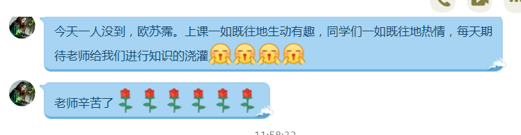 课堂到课情况很好,每次课都有助教及时统计,而且大家也能及时加入课堂打卡。我们每一次课的打卡任务都不同,内容精彩,形式多变。不让课堂到课率变成枯燥的形式主义。