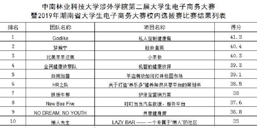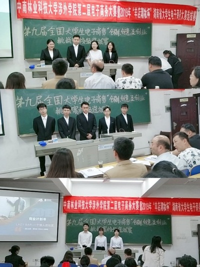 2019年5月15日下午两点在一教楼1303举行了中南林业科技大学涉外学院第二届电子商务大赛校内选拔赛。经济与管理学院刘天祥,学工部副部长粟臻,学工部副部长兼大学生创新创业中心主任艾亮杓,省赛赞助商御家汇股份有限公司的水羊国际“羊店潮妆”BD宋程程女士,水羊国际“羊店潮妆”运营经理李泽先生担任比赛嘉宾评委。