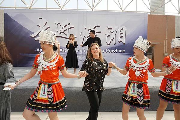拾点乐队一曲《温柔》点燃全场之后,师生们为远道而来的朋友准备许久的潇湘文化盛宴随即开席了。“刘大姐!哎!我的妻!嗳!”经典的花鼓戏旋律引起了在场所有人的共鸣。轻快的音乐,灵动的苗族少女,大家携起外国友人的手,一起载歌载舞。