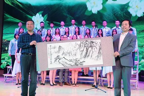 北美之星团长刘振宇和我院董事长及师生同台献唱一曲《茉莉花》,将整个活动推入高潮。董事长朱定强现场将一幅水墨画赠与北美之星艺术团,作为“家乡人民”的殷切希望和美好祝福。