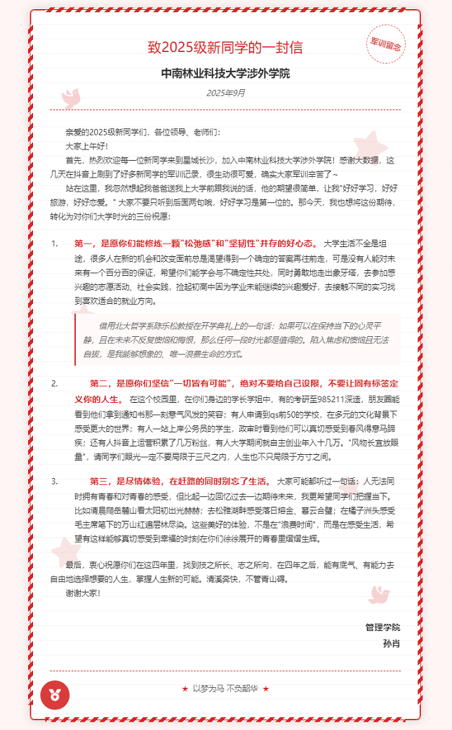 2025年9月12日,管理学院新进教师孙肖作为教师代表在中南林业科技大学涉外学院2025年开学典礼暨军训总结表彰大会上发言。