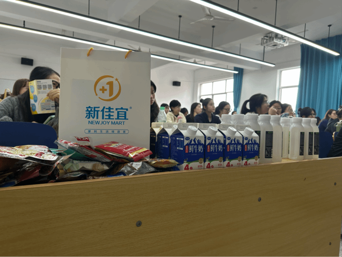 在互动环节中,新佳宜带来了多种自营品牌产品与同学们分享,现场气氛热烈。企业代表还就学生普遍关心的"储备干部与普通店员区别""职业发展路径"和"薪资待遇"等问题作出细致解答。企业代表表示:储备干部作为管理层培养对象,将接受系统化培训并享有快速晋升通道,而店员岗位更侧重一线业务实操;清晰的晋升机制和具有竞争力的薪酬体系,体现出新佳宜对人才发展的长期投入与责任感。