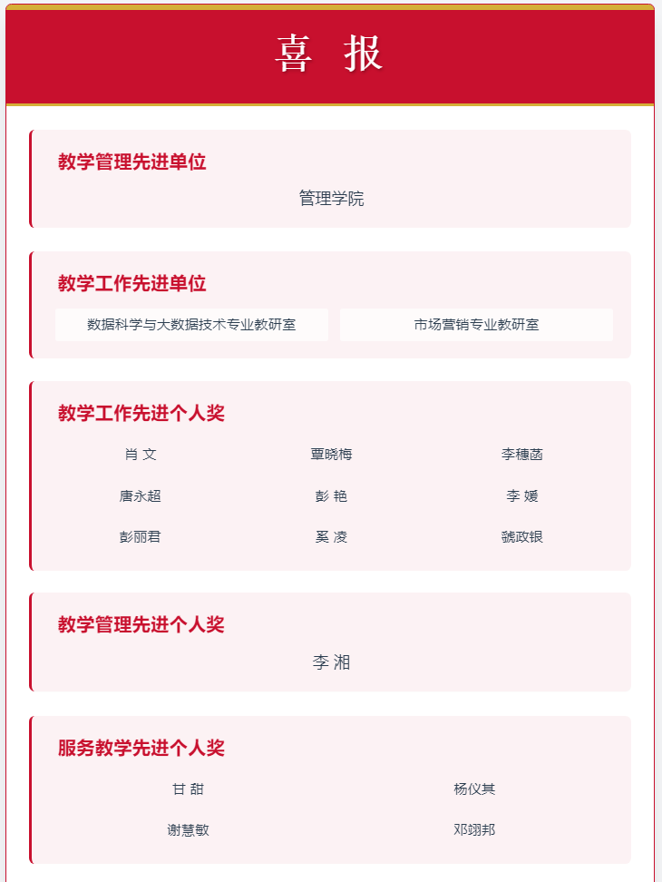 · 李湘老师因在教学管理工作中展现出的卓越组织能力与服务意识,获评“教学管理先进个人奖”,其负责的数字化论文管理平台建设有效提升了教学工作效率,获师生一致好评。