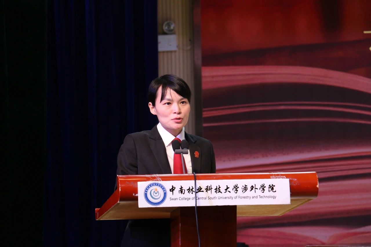 温雅琴(院长助理)致辞:温雅琴老师首先对各位评委、老师的到来表示热烈欢迎,并指出此次比赛不仅是一次知识与技能的较量,更是一场对法律信仰正义追求的深刻诠释。同时希望同学们通过此次比赛,理解法律背后的社会价值和道德考量,从而在实践中领悟社会主义核心价值观的深刻内涵,在思辨中成长,在角色扮演中学会共情,在法律与道德的碰撞中寻找自我。