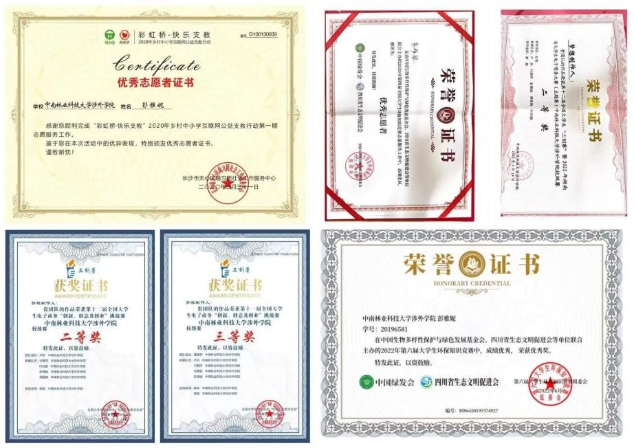曾任班级团支书,曾获校级优秀学生奖学金,“优秀共青团干部”、中南大学2021年“苗圃计划”国际组织青年人才培训班优秀学员称号,2019年“外研社国才杯”全国英语阅读大赛校级初赛特等奖,发表《公布生效裁判文书作为消除影响、恢复执行方式的规范构造——简评民法典第一千条第二款》独著论文。积极投身志愿服务,疫情期间积极参与防控工作。