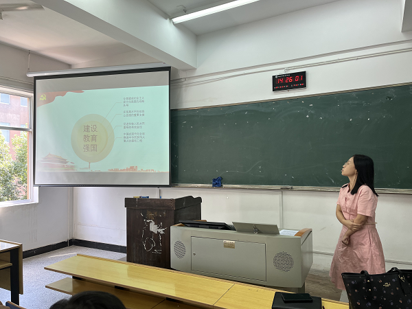 其后,杨娟同志以“为中华民族伟大复兴贡献强大教育力量”为题,分享了学习贯彻习近平总书记关于教育的重要论述的学习体会。第一,以教育之力厚植人民幸福之本,以教育之强夯实国家富强之基。第二,我们要建设的教育强国,是中国特色社会主义教育强国。第三,把高质量发展作为各级各类教育的生命线,加快建设高质量教育体系。第四,坚持系统观念,统筹推进育人方式、办学模式、管理体制、保障机制改革。最后进行总结,建设教育强国是全党全社会的共同任务,强调马院担当、涉外责任。