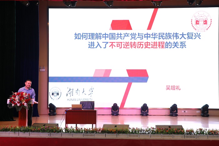 湖南大学马克思主义学院副院长吴增礼教授作《如何理解中国共产党与中华民族伟大复兴进入了不可逆转历史进程的关系》主题讲座。首先,吴教授带领大家回顾了党的二十大报告15个章节内容的中心思想。从启航者、掌舵者、圆梦者的角度,具体解析了历史选择与主动精神,百年伟业与堪当大任,主心骨与通脉安人的具体内容。他表示中国共产党是实现中华民族的真正启航者,中国共产党领导是中华民族伟大复兴历史发展的必然选择。在民族复兴历史征途中,中国共产党是唯一的核心领导力量。从人类文明发展和世界历史的宏观视野来考察, 实现国家现代化、复兴中华文化贡献人类社会是实现中华民族伟大复兴中国梦的三个重要维度。