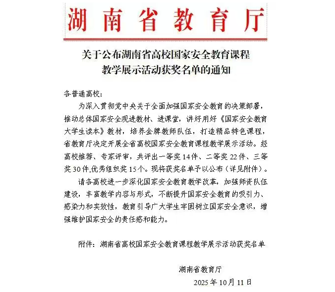 此次在湖南省高校国家安全教育课程教学展示活动中取得的优异成绩,不仅是对学校高度重视国家安全教育工作、积极组织教师参与活动的肯定,也充分体显了我院国家安全教育课程老师的扎实功底。未来,学院也将进一步巩固活动成果,深化教学创新,不断提升国家安全教育的吸引力与感染力,切实引导广大学生牢固树立总体国家安全观,为培养德才兼备、担当民族复兴大任的时代新人贡献力量。