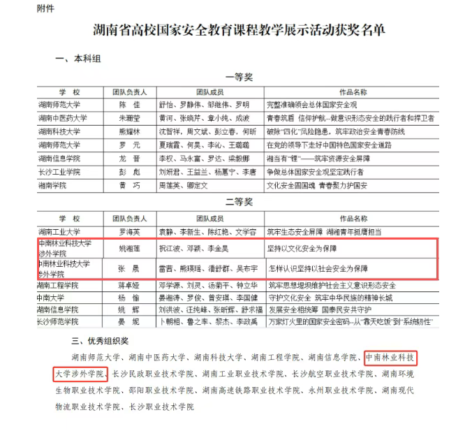 近日,湖南省高校国家安全教育课程教学展示活动评选结果正式公布。中南林业科技大学涉外学院选派的两支师生团队凭借出色的教学设计与现场表现,双双荣获省级二等奖,学院同时获评“优秀组织奖”,充分展现了该院在深化国家安全教育教学改革、提升育人实效方面取得的扎实成效。