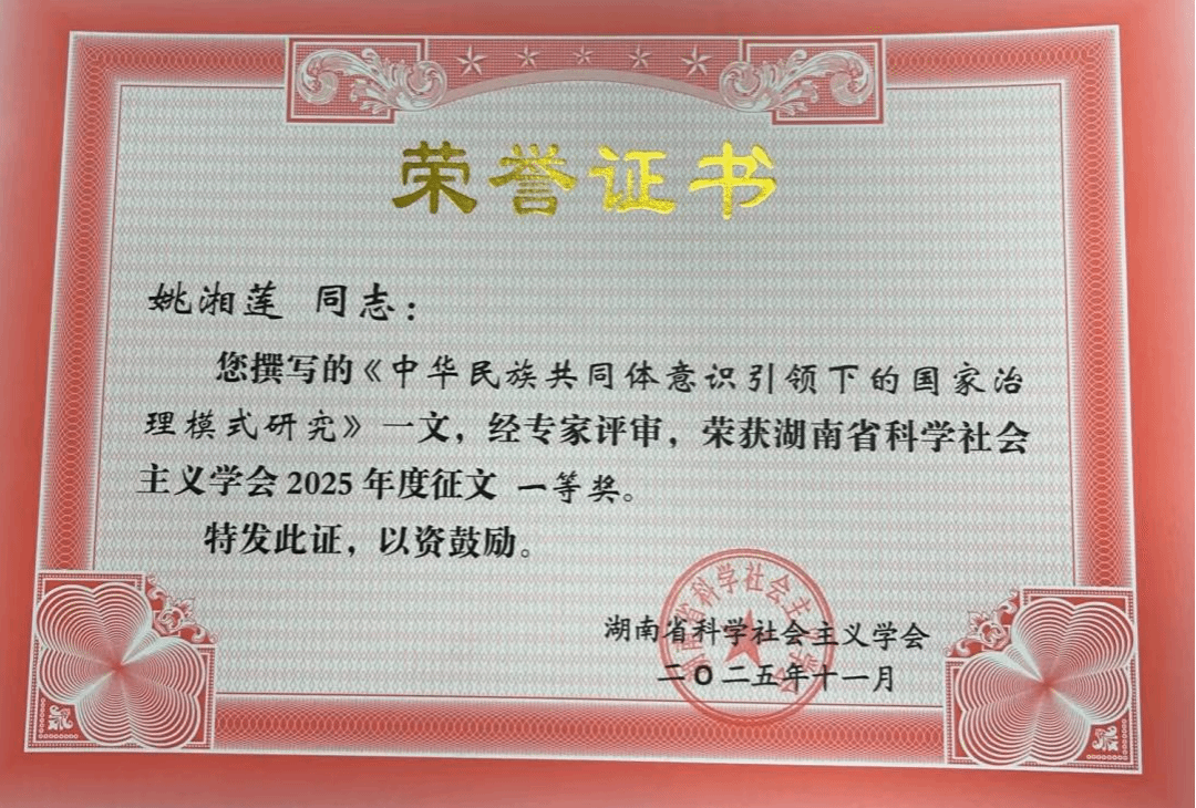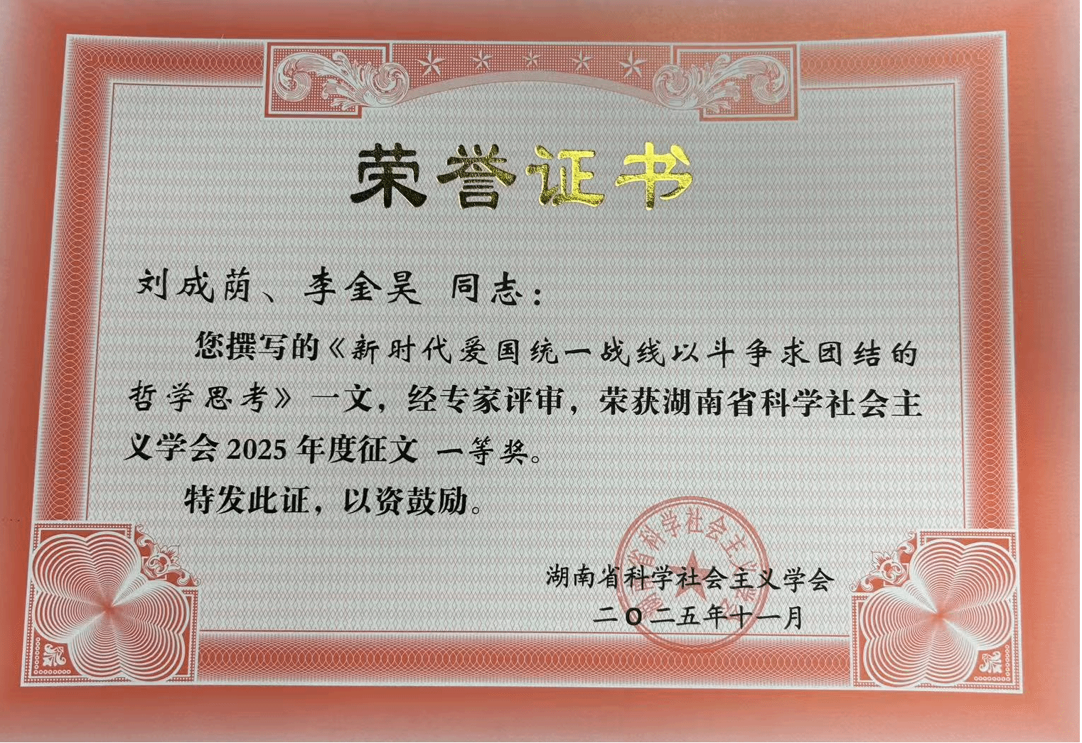 11月15日,“统一战线与中国特色社会主义”理论研讨会暨湖南省科学社会主义学会2025年年会在中共湖南省委党校(湖南行政学院)召开。我院副院长姚湘莲副教授撰写的《中华民族共同体意识引领下的国家治理模式研究》、青年教师李金昊参与撰写(排名第二)的《新时代爱国统一战线以斗争求团结的哲学思考》双双获得一等奖。此外,刘凤健院长以该会顾问身份出席会议,并作《推进祖国统一大业中的军队使命任务》的主旨发言,获得与会代表的一致好评。本次会议进一步巩固了我院与湖南省科学社会主义学会及各兄弟院校的交流纽带,相关成果将为营造学院浓厚学术氛围、推动马克思主义学院实现高质量内涵式发展注入持续动力。