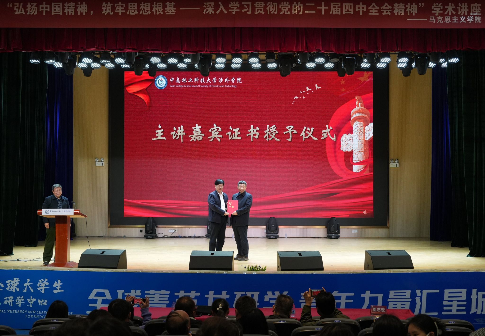 讲座尾声,中南林业科技大学涉外学院院长周志宏为李佑新教授颁发主讲嘉宾证书,并作总结讲话。他表示,李佑新教授专场讲座思想深邃、催人奋进,为学校高质量发展注入了强大精神动能与理论指引,全院上下都要以此次学习为契机,深刻把握精神谱系的实践要求,将其转化为谋划工作的思路、推动发展的举措、服务师生的实效。下一步,学校将以精神谱系为引领,把精神力量深度融入人才培养、学科建设、管理服务等各方面,持续深化教育教学改革,赋能新时代思政教育新实践,为推进教育强国建设、实现中华民族伟大复兴的中国梦贡献中南林涉外力量。