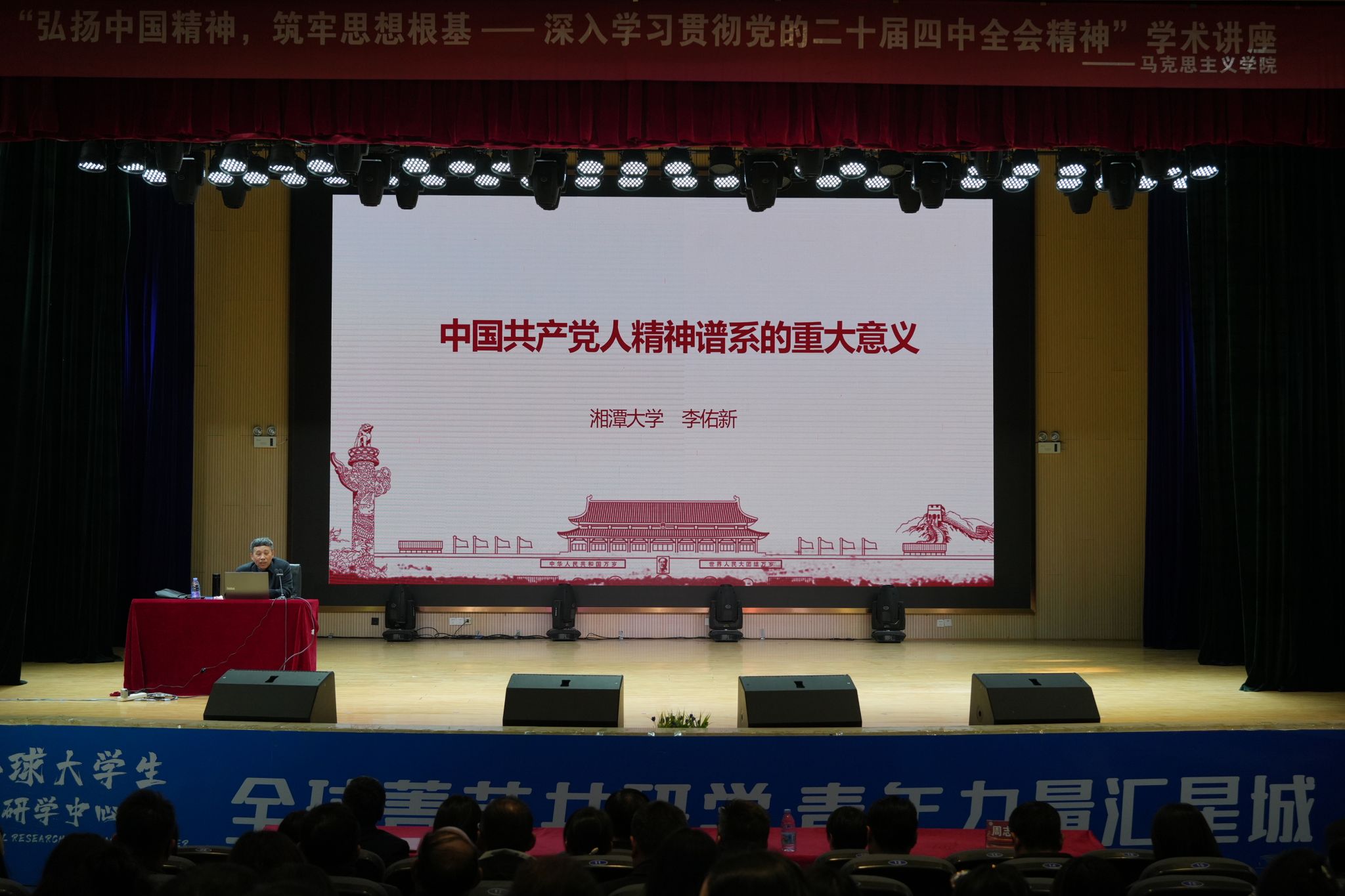 2025年12月3日下午,中南林业科技大学涉外学院马克思主义学院隆重举办“弘扬中国精神,筑牢思想根基——深入学习贯彻党的二十届四中全会精神”专场学术讲座,特邀教育部“长江学者”特聘教授、湘潭大学毛泽东思想研究中心主任李佑新教授,以“中国共产党人精神谱系的重大意义”为主题,带来一场兼具理论深度、历史厚度与时代温度的思想盛宴,以思想之光点亮校园育人之路。中南林涉外学院院长周志宏、各中层管理干部出席活动,全体专职教师、辅导员及部分学生代表参与其中,共赴精神之约,共汲奋进力量。