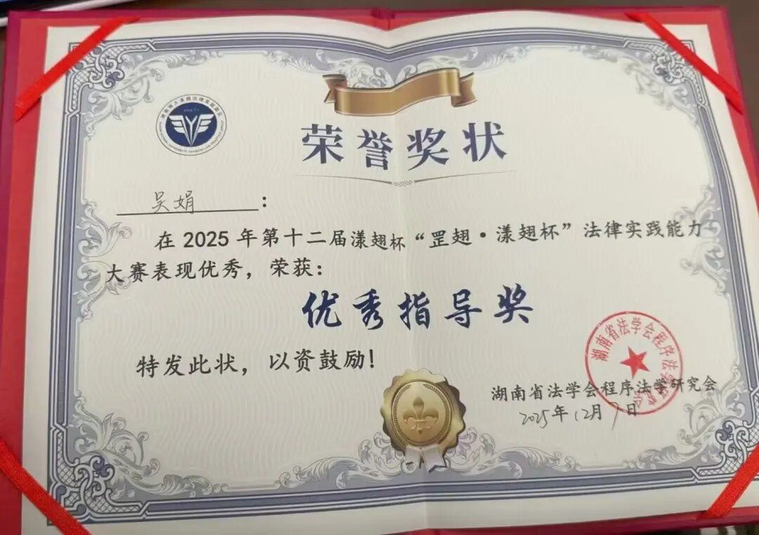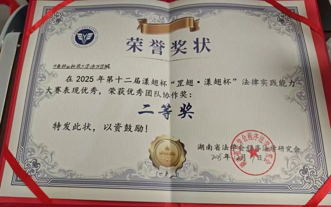 中南林业科技大学涉外学院新视域文化产业学院组织马克思主义学院代表队(指导老师:吴娟;领队:2024级法学国际实验班旷国强;队员:2023级法学0102班唐晚霞[原告代理人]2023级法学0103班陈雨嫣[原告代理人]2023级法学国际实验班向臻锬[原告]2024级法学0101班杨迎照[书记员]2024级法学国际实验班张泓宇)凭借扎实的法律功底、敏捷的思辨能力与出色的庭辩技巧,力克强敌,荣获优秀团队协作奖二等奖,吴娟老师荣获优秀指导奖。