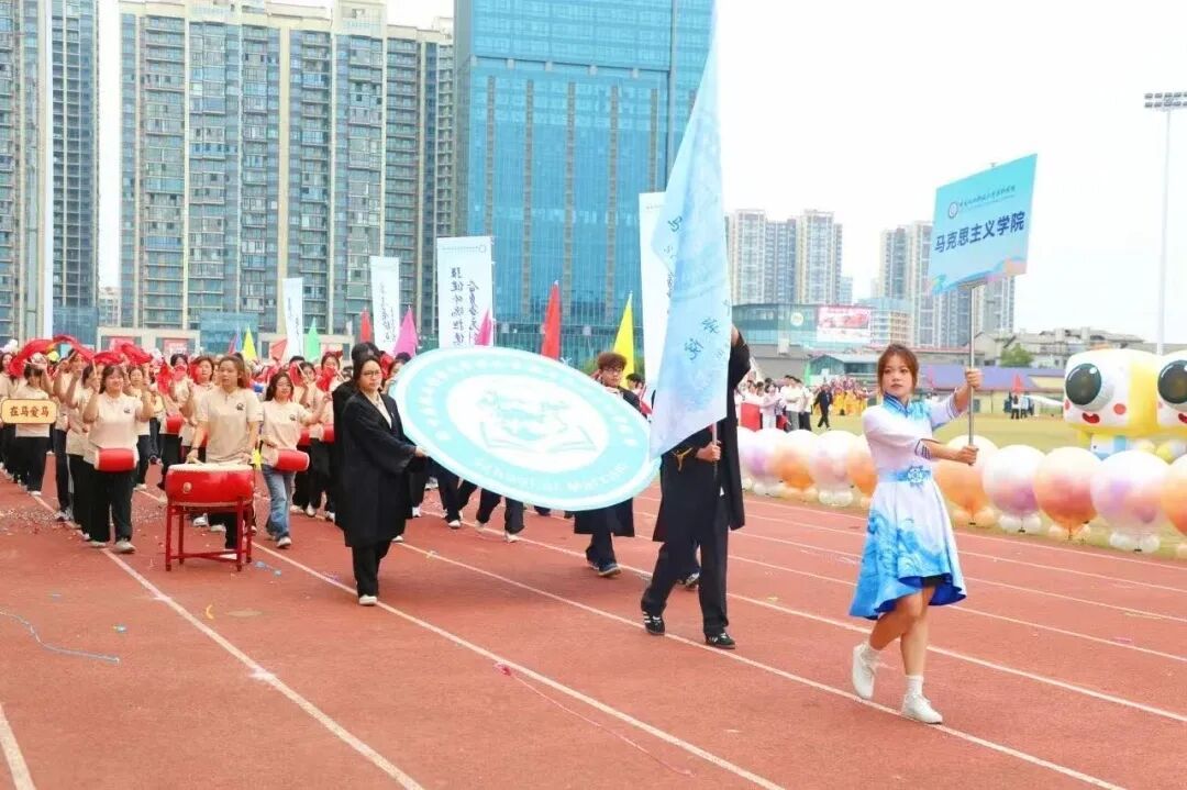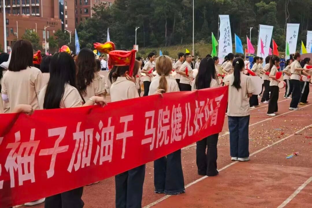 马克思主义学院的方阵身着统一的米白色服装,方阵中,鲜红的腰鼓飘带迎风招展,尽显着马院学子坚定的理想信念;整齐划一的动作,凝聚着集体的力量与默契。他们恪守“青火不熄,百马争先”的精神,以“真理在手,使命在肩”为信条,将理论学习中的严谨态度融入赛场拼搏的热血豪情。