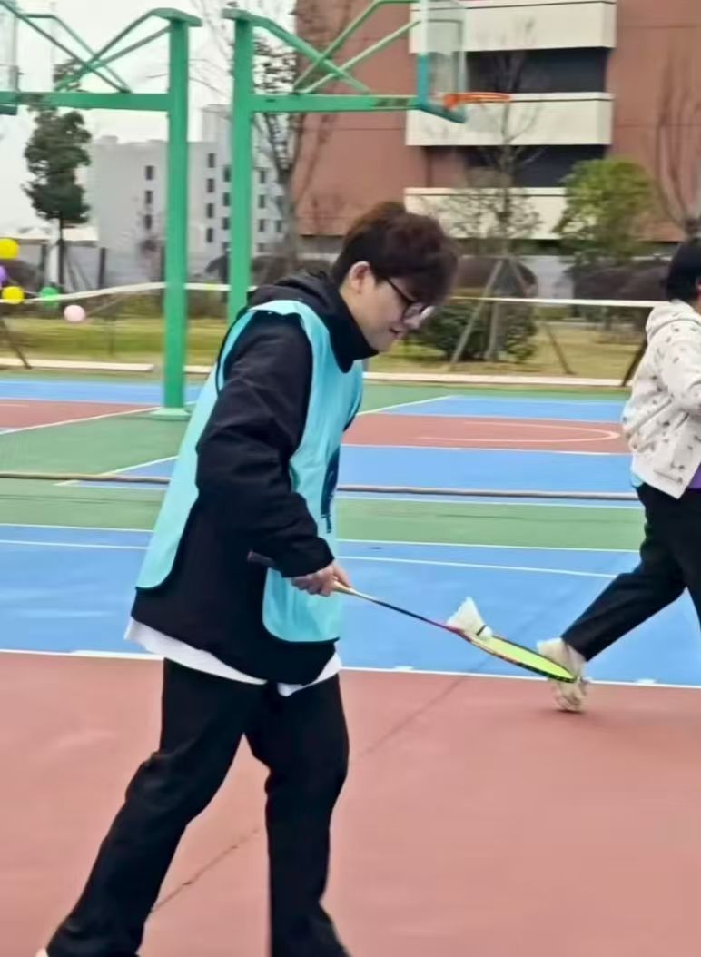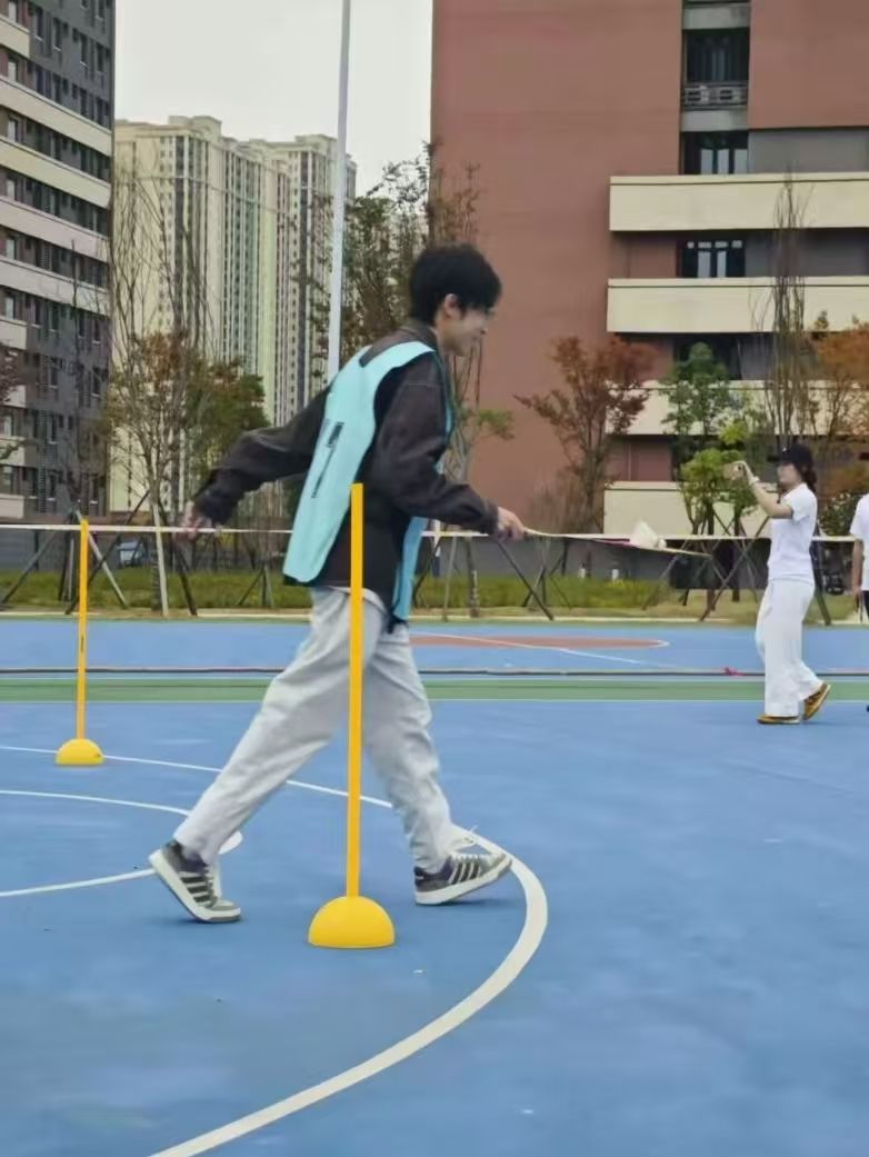 羽毛球绕杆接力赛场,队员们手持球拍带球疾行,辗转腾挪间精准绕杆,配合无间,每一次交接都利落干脆,满眼皆是速度与默契;