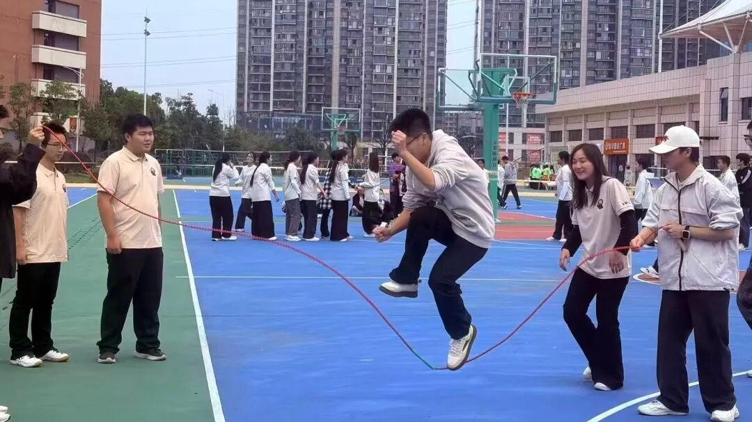 集体跳绳现场更是热闹非凡,长绳翻飞如彩虹闪烁,队员们纵身跳跃、衔接流畅,展现出超强的团队协作与青春活力。
