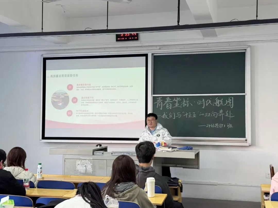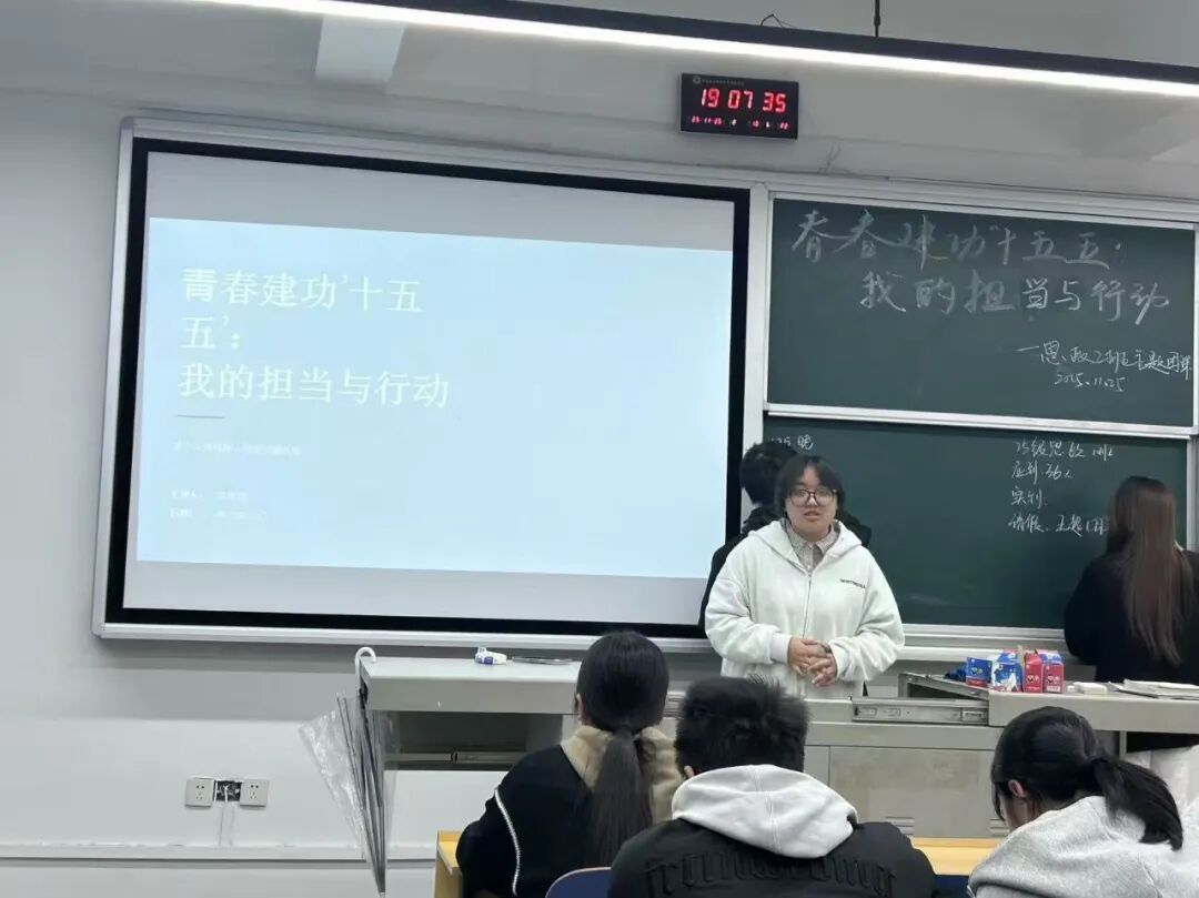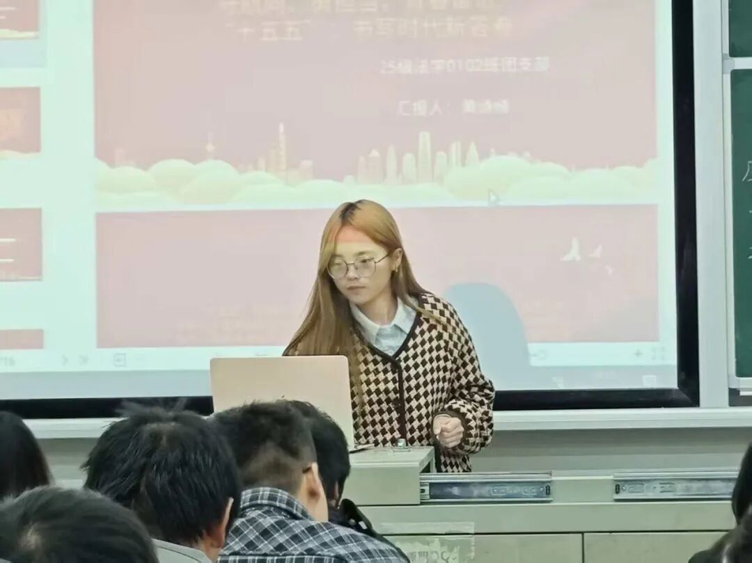 2024级法学2班张心柠同学围绕“乘十五五东风 燃青春奋斗之火”主题,阐述了“十五五”规划的战略定位、对青年的深远意义与相关政策红利,明确了新时代青年的政治、时代、责任担当,还介绍了包含理论学习、实践参与、志愿服务等环节的主题团日活动安排,号召青年将个人理想融入国家发展,以奋斗助力“十五五”建设。