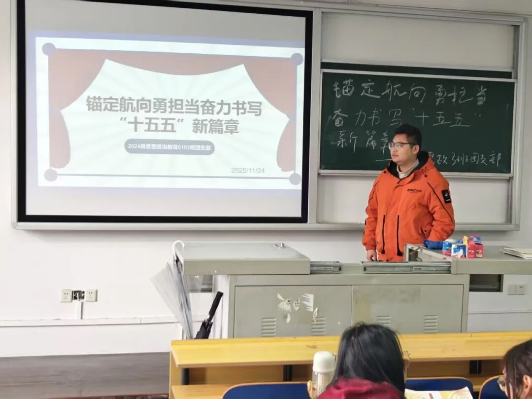 “十五五”号角吹响,现代化蓝图铺展,青年一代肩负时代使命。为深入学习“十五五”规划精神,凝聚青春力量,2024级思政4班举办了相关主题团日活动。活动以理论学习解读规划要义、主题研讨碰撞思想、实践倡议凝聚共识,推动规划精神入脑入心。作为思政学子,班级始终坚守“立德树人”初心,践行“家国担当”使命,未来将以专业素养传递正能量、彰显真担当,让青春在“十五五”建设中绽放光彩,以青春之我书写奋进答卷!