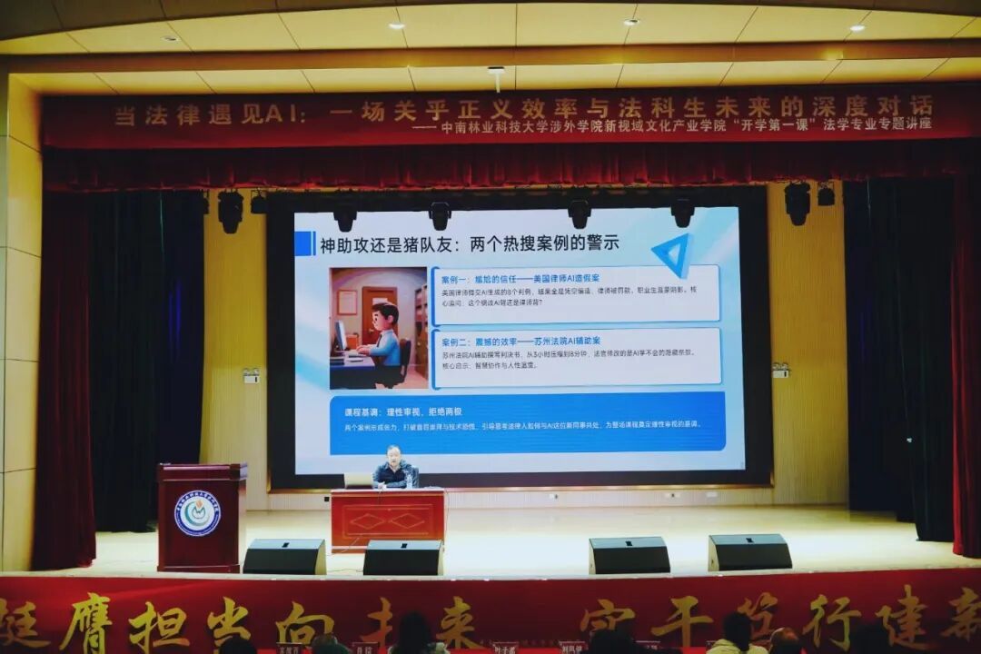 本次开学第一课围绕「当法律遇上AI」核心命题,展开一场关于正义、效率与法科生未来的深度探讨。讲座以两大热搜案例为切入点,直观展现AI的“双面镜像”——既为法律工作带来巨大便利,也暗藏着技术风险与伦理挑战。随后以司法场景为落脚点,全面解析AI作为“效率狂魔”“数据分析师”“规则塑造者”的三重角色,清晰呈现技术如何重塑庭审流程、证据研判与裁判逻辑,让学子们直观感受科技对司法实践的深刻变革。