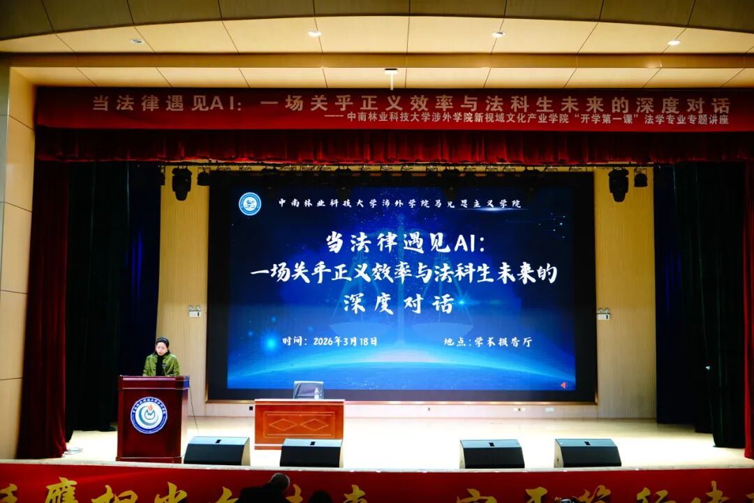 为引领法学专业学子把握科技浪潮与法治发展的时代交汇点,明晰人工智能时代法律人的使命担当与发展方向,由中南林业科技大学涉外学院新视域文化产业学院主办、马克思主义学院承办的法学专业“开学第一课”活动专题讲座于2026年3月18日下午在学术报告厅顺利开展。马克思主义学院院长刘凤健、党总支书记徐婷、院长助理温雅琴及法学专业全体师生齐聚一堂。本次讲座由院长助理温雅琴主持,特邀开福区人民法院审判委员会专职委员叶子龙博士,以“当法律遇见AI:一场关乎正义效率与法科生未来的深度对话”为主题,从多维视角解锁法律与人工智能的融合密码,为法科学子搭建起技术与法治相融的成长桥梁。