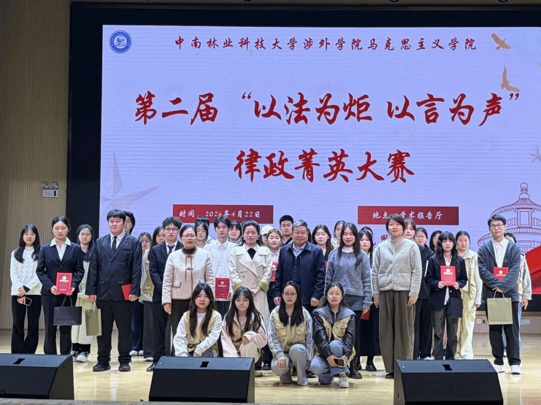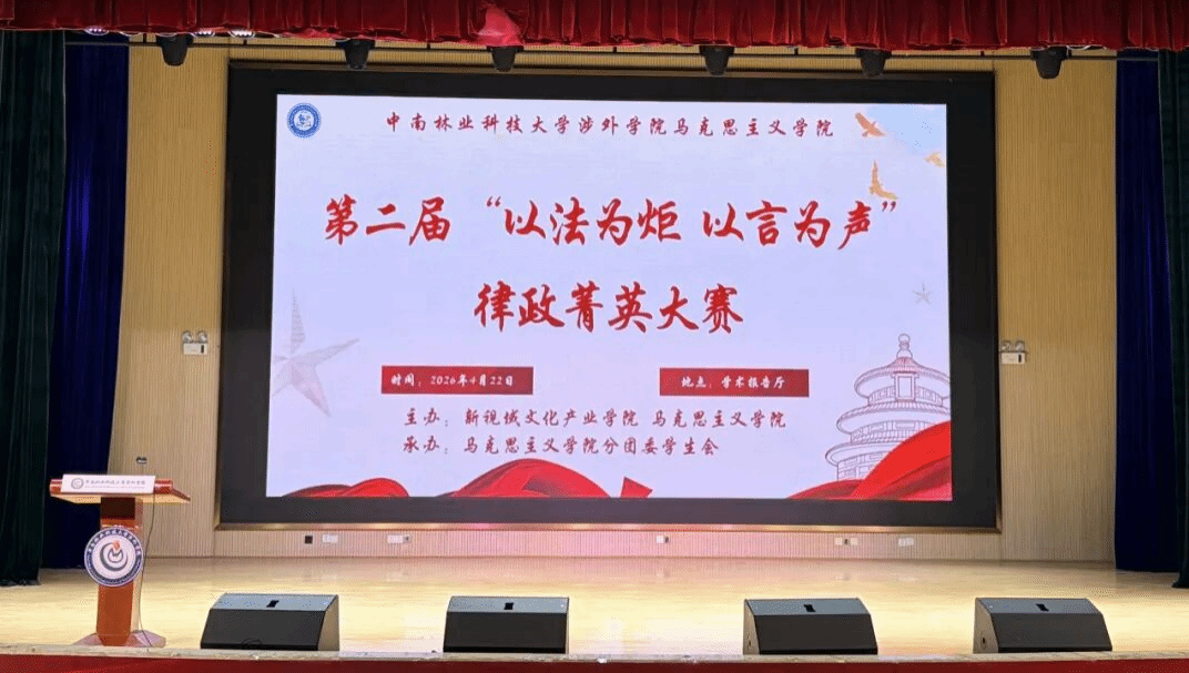 为深入学习贯彻习近平法治思想,全面弘扬宪法权威与法治精神,切实筑牢青年法治信仰,推动校园法治文化建设走深走实,营造全校尊法学法、守法用法的良好育人氛围,2026年4月22日,由中南林业科技大学涉外学院新视域文化产业学院主办的第二届“以法为炬,以言为声”律政菁英大赛于学术报告厅顺利举办。