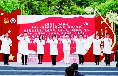 北京大学援鄂医疗队代表在北大五四青春诗会上宣誓。 新华社发