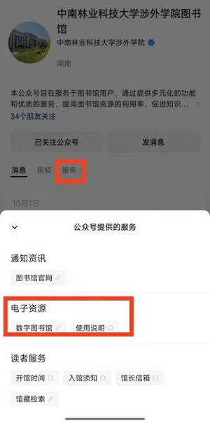 查找途径一:在“中南林业科技大学涉外学院图书馆”公众号首页“服务”中的“电子资源”模块查看“数字图书馆”。