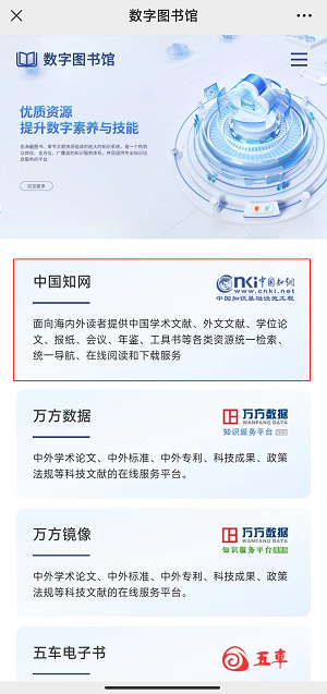 1.校内手机端使用——连接校园网,进入微信公众号“中南林业科技大学涉外学院图书馆”,点击“电子资源”——“数字图书馆”——右上角“···”——选择“在浏览器打开”并切换成网页版——“中国知网”即可使用;
