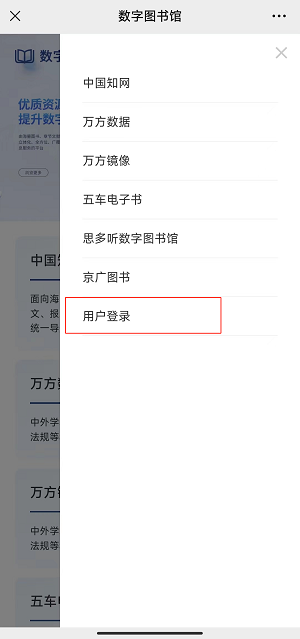 2.校外手机端使用——进入微信公众号“中南林业科技大学涉外学院图书馆”,点击“电子资源”——“数字图书馆”——右上角“≡”——点击“用户登录”——登录英华学堂在线课堂账号即可使用。