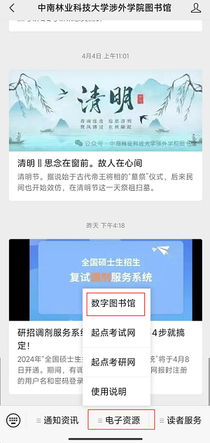 关注微信公众号“中南林业科技大学涉外学院图书馆”